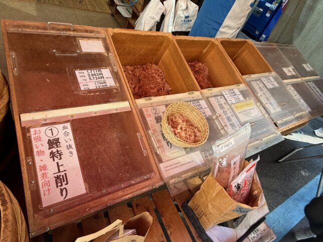 店頭はこんな感じで削り節をグラム単位で買うことが出来ます。血合医を抜いたもの、混合節など様々な種類があります。