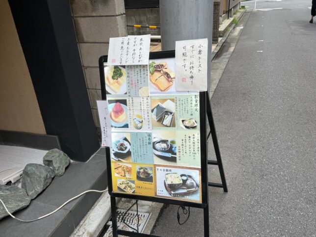 という、天のやさんの外観です。たまたま通りがかったところ、すごくラッキーな看板を見つけます。 看板をアップで。左上の文字見えますかね。「本日あとわずかですが、予約なし土産玉子サンドご用意ございます」。本当に寄って良かった…。