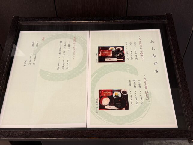 そして、お品書きです。お重に入るうなぎ丼ぶりと、セパレートタイプの鰻定食があります。