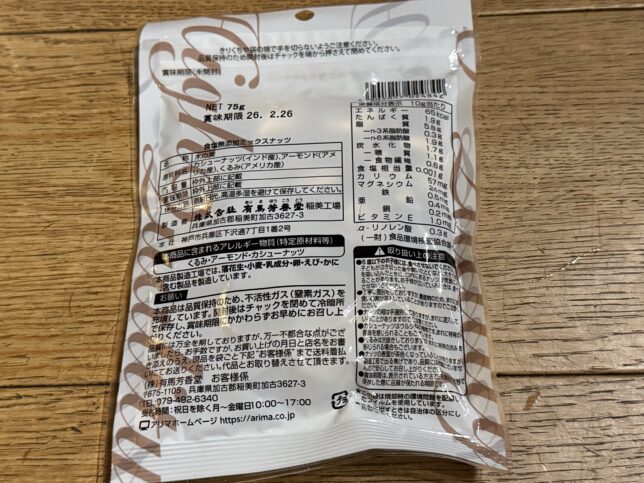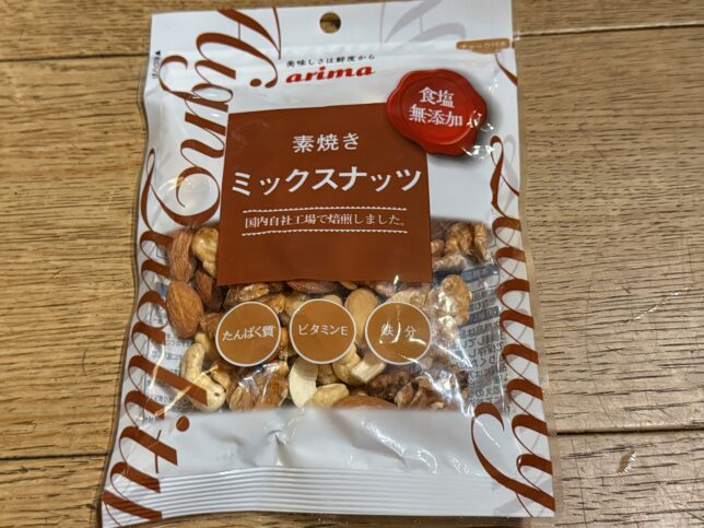 という有馬芳香堂さんの素焼きミックスナッツを購入しました。食塩無添加の素の味を楽しむタイプです。タンパク質・ビタミンE・鉄分と取れる成分が書かれているのもポイント高い。