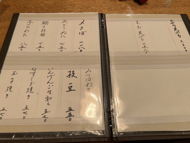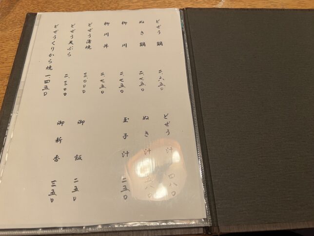 暖簾の渋さも最高ですねぇ。 店内に入りました。こちらがメニュー表です。1ページ目は殆どがどじょうメニューなのが、わかりやすくて良いですね。