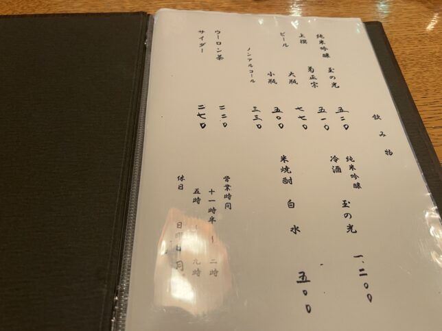 2P目はおつまみ系メニュー中心でした。子のわた、頼めば良かった…! 最後のページが飲み物です。日本酒・ビール・米焼酎にソフトドリンクがあります。