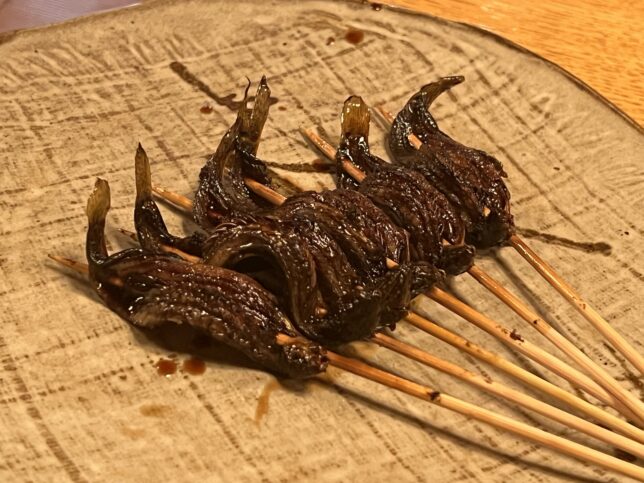そして、こちらが同店名物のくりから焼きですね。くりからは、不動明王が持つ倶利伽羅剣に由来する食べ物で、倶利伽羅剣に黒い龍が巻き付いている姿を模して、串に巻きつけいるのが特徴です。鰻のくりから焼は老舗店で稀に見かけますが、どじょう版は初めてみた。