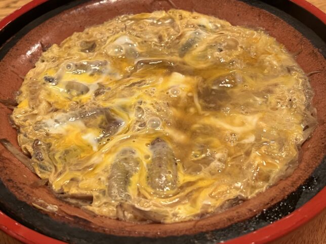 こんな感じで、どじょうと牛蒡を煮込んで卵で閉じたものです。ご飯の上にかけて食べるのが最高です。