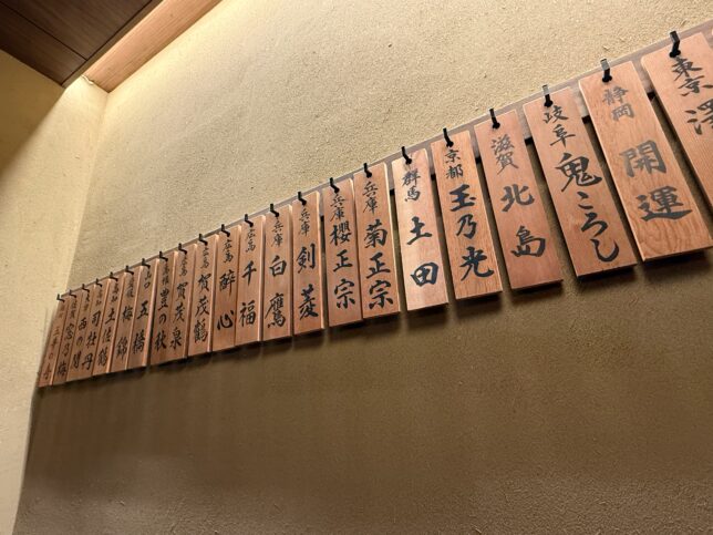カウンターがいっぱいだったので、裏手の席に通してもらいました。壁一面に貼られる日本各地の日本酒達。地元のお酒があると嬉しくなっちゃうよね。