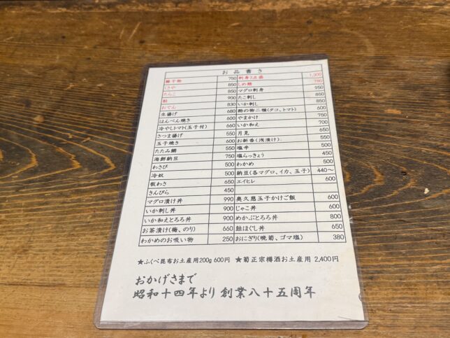 こちらがメニュー表です。酒場なので、ご飯物っぽいものはさほど多くなく、お酒のつまみになるもの、日本酒が美味しくなるものがラインナップされています。ちなみに”くさや”が名物で、店内に入るとくさやの匂いが大体します(誰かが頼んでるから)。