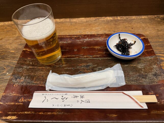 今回はビールスタートしました。お通しが昆布の佃煮なのがまた良いですね。