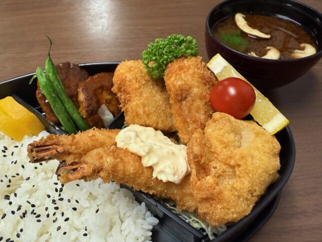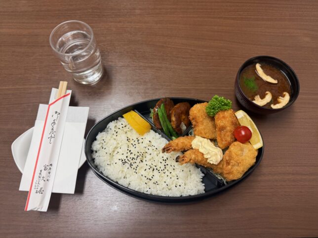 おかず部分をアップでどうぞ。ポーションが小さめに作られているのは、芸妓さん向けに作ったから、のよう。揚げ物が複数と一口で食べられるハンバーグと、みんな大好きメニューが複数入ってて最高でした。