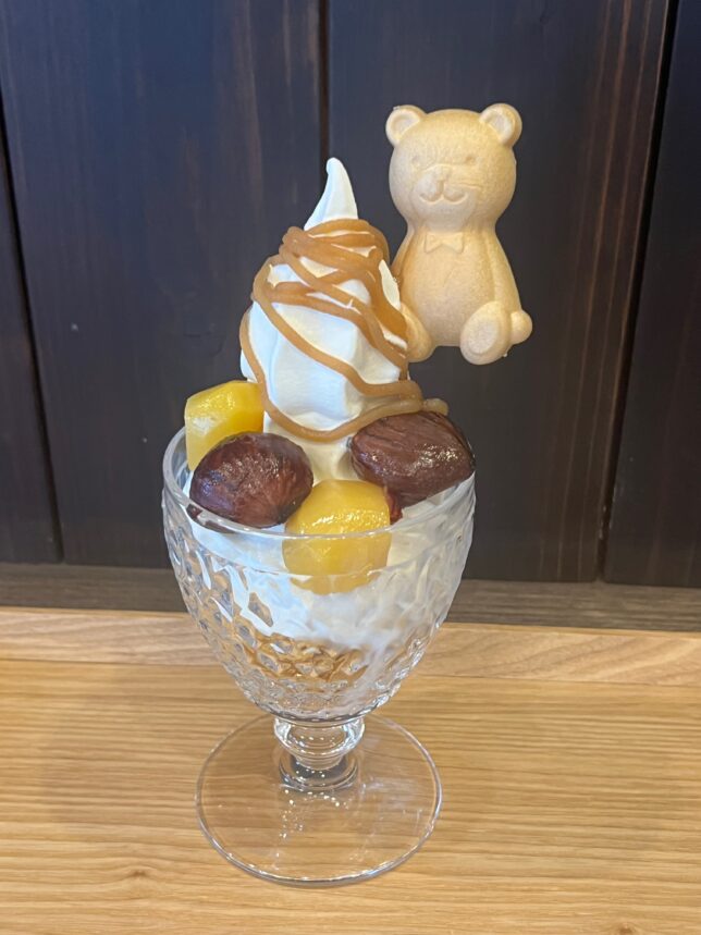 この可愛さ、アップでどうぞ。オブセ牛乳のソフトクリームと栗のはまり度合いが凄い。めっちゃ美味しい!!