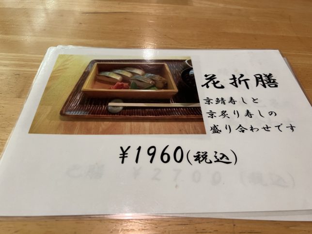 今回は花折膳をオーダーです。京鯖寿しと京炙り寿しの組み合わせです。豪華だなぁ。