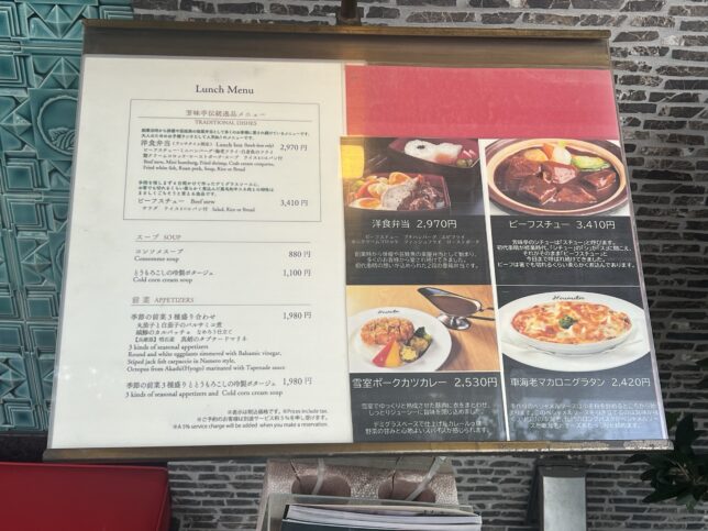 店頭にはメニュー表も。写真が載っている4メニュー、洋食弁当・ビーフスチュー・雪室ポークカツカレー・車海老マカロニグラタンのビジュアルが強すぎる。