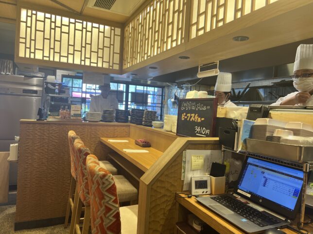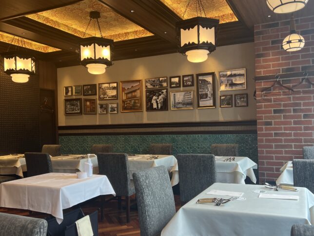 今回はテーブル席に。リニューアル後お伺いするのが初めてだったのですが、高級レストランのような見た目になっていました。とはいえ、レトロ感もきちんと表現されていて、とても心地よい。