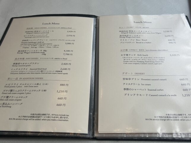こちらがランチメニューです。肉・魚介・更に一品、って区分が良いですね。と、プリンアラモードがあるところに、このお店が横浜のホテルニューグランドの流れだと感じますね。