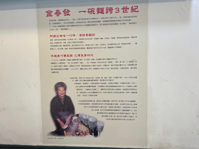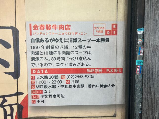 MRT北門駅から徒歩約8分ほど、MRT中山駅から徒歩10分ほどの場所にある 金春發牛肉店 天水總店。1897年、初代・陳屋氏が、屋台店として創業したことが始まりの、台北最古級の飲食店の1つです。店名は「金=黄金」、「春=有余」m「發=発財」という縁起担ぎから名付けたとされおり、現在は4代目がその味を引き継いでいます。名物は清燉牛肉湯という牛肉の透明なスープで化学調味料等を使わず30時間煮込んで作る味わいとのことです。