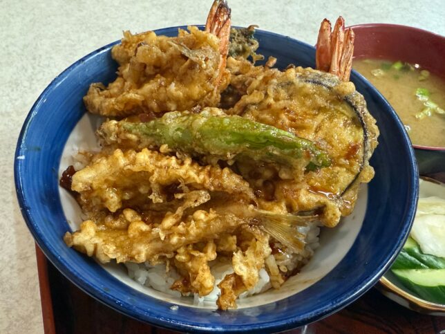 そして天丼です。ガッツリ系で、ごま油比率の高そうな色と香りをしていました。