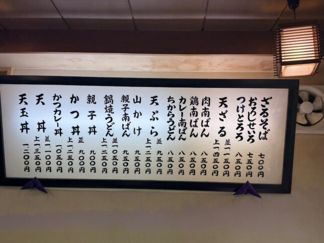 店内に入りました。こちらがメニュー表です。フォントが可愛い。そば・うどん・丼もののラインナップです。店内は近隣で働いていると思われるサラリーマンの方、地元の方なので溢れかえっていました。