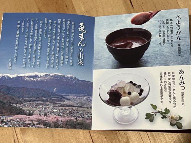こんな紙も入っていました。亀まんの由来が書かれています。右ページの水ようかん・あんみつも食べてみたいなぁ。