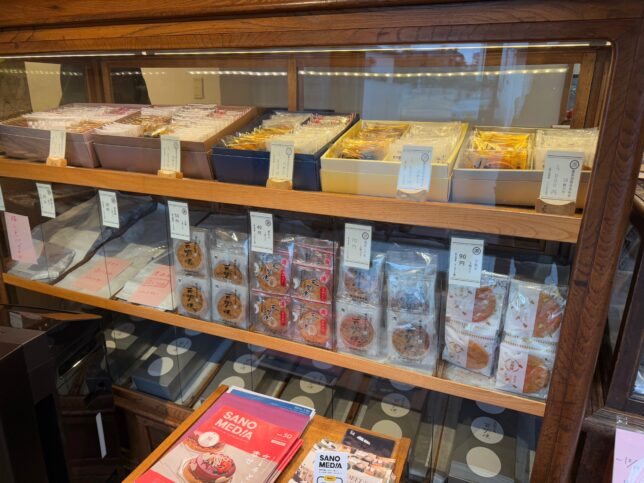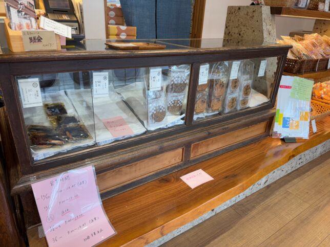 店内に入りました。1枚毎でも買える煎餅が、ガラスケースに入っています。