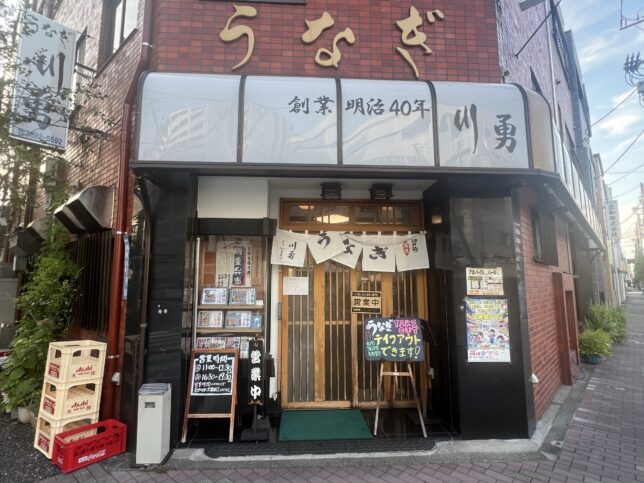 という、うなぎ川勇さんの外観です。ファサードの部分に「創業明治40年」と書いてあるのが、わかりやすくて良いですね。レンガ調の外観も素敵。
