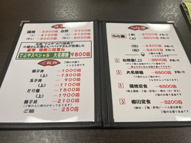 メニュー表は鰻屋さんですので、このページはうなぎメニュー中心ですね。元祖!でぶやの出演店であり、その際に石塚さん・パパイヤ鈴木さん・小錦さんが食べられた蒲焼三段重ね・でぶやスペシャル大名御前も名物の1つです。