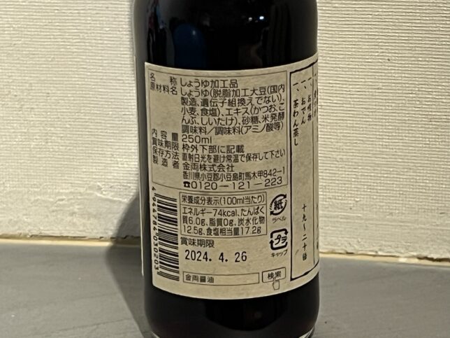 ラベル裏側です。醤油・出汁系のエキス・砂糖・米発酵調味料・アミノ酸等が入っています。