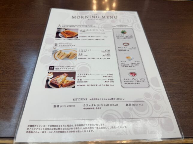 壁側です。アンティークな調度品で統一されているのも、人気の要因なのだろうね。 こちらがメニュー表です。モーニングは3種類あって、A・トーストセット、B・サンドイッチセット、定番・丸福カリートーストです。めっちゃ悩むバリエーションだ。オプションでミニサラダ・ゆでたまご・スープ・ミニヨーグルトがチョイスできます。ドリンクは珈琲・カフェオレ・紅茶の3種類からチョイスです。