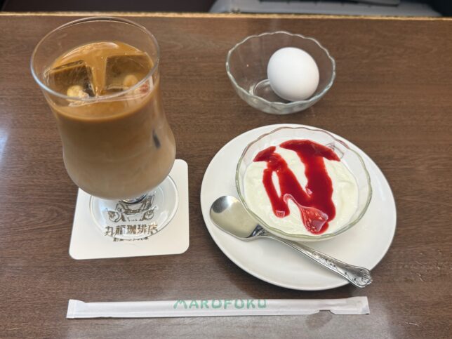 この日は豪華にオプションはゆでたまご・ミニヨーグルトの2つをオーダーしました。ドリンクはアイスカフェオレです。