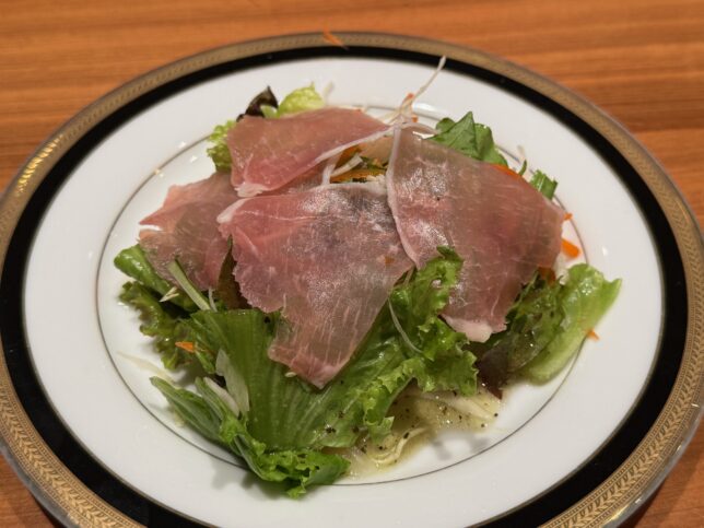 今回はセットでオーダーしました。まずは生ハムのサラダが運ばれてきます。