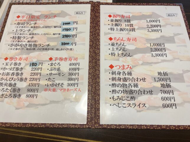 メニュー表はこんな感じです。後述しますが、玉子巻きが入っているメニューをオーダーすることをお勧めします。