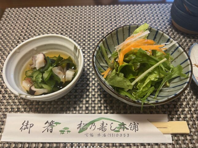 今回はランチのセットをオーダーしました。まずはサラダと酢の物が出てきます。