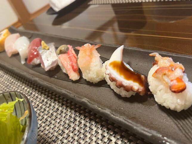 で、お寿司がでてきます、見てほしいのは一番奥の子です。次の写真のほうが見やすいですが。