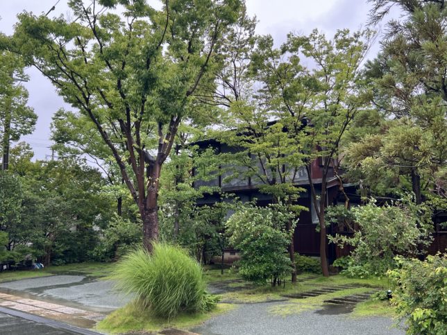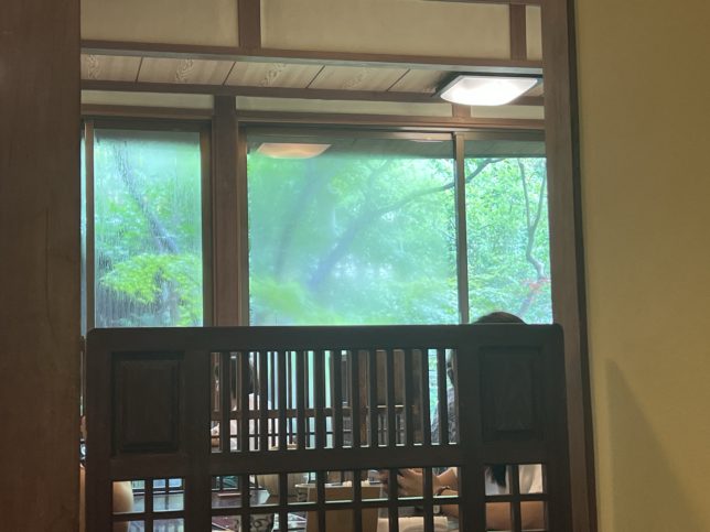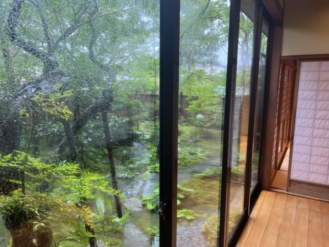 店内に入りました。雨の日だったので窓ガラスが曇っていますが、こんな感じでお庭の緑を楽しむこともできます。