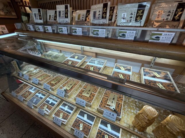 店内に入ります。昆布の佃煮がずらっと並んでいます。黒と黄色っぽく見えるものが混じり合っているのが黒潮です。