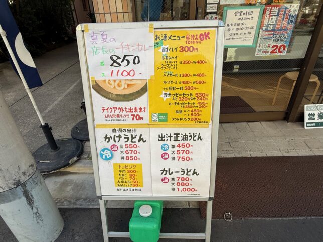 店頭の看板です。カレー・うどん・お酒メニューが載っています。お酒は昼からオーダー可能ですよ。