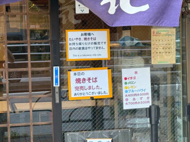 現在はイートインはなく、持ち帰りのみです。麻布の浪花家さんと同じく、焼きそばやかき氷も販売されています。この日焼きそばは、残念ながら売り切れでしたけれど。