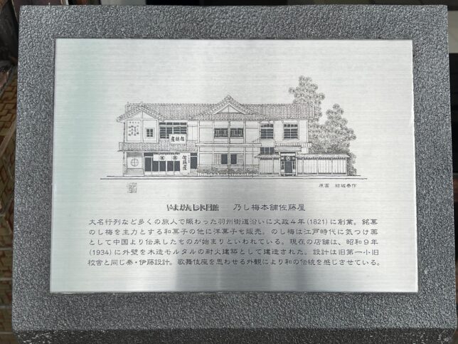 三日町角・十日町南のバス停から徒歩2分ほど、山形駅から徒歩16分ほどの場所にある 乃し梅本舗 佐藤屋。1821年(文政4年)、佐藤松兵衛氏が山形藩の城下町で和菓子店を創業したことが始まりです。山形には”のし梅(乃し梅)”という銘菓がありますが、このお菓子は山形藩主の典医だった小林玄端(げんたん)が開発した気付け薬が原型となります。小林玄端の末裔である黒田家に生まれたのが、乃し梅本舗 佐藤屋初代の松兵衛氏で、後に3代目・松兵衛氏が乃し梅を現在に近い形で完成させています。そのため、佐藤屋さんが乃し梅の元祖店となります。