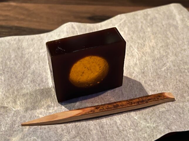 とても、色合いが綺麗な棹菓子で、プルプルの寒天の中に空が表現されていてとても綺麗です。切る前も写真撮っておけば良かった…!
