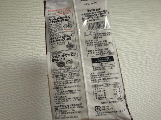 という、おびなたさんの信州生戸隠そばを購入しました。自家挽きそば粉を使用しているとのこと。常温保存可能な生麺なので、取り扱いが楽で良いですね。