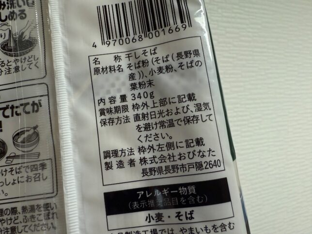 原材料はそば粉・小麦粉・そばの葉粉末。そばの葉を使うのはメジャーなのかな(茹で終えた写真撮り忘れました)。