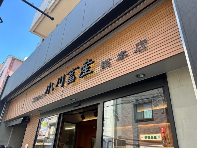 ファサードの上部をアップで。創業昭和十三年小川畜産総本店と書かれています。