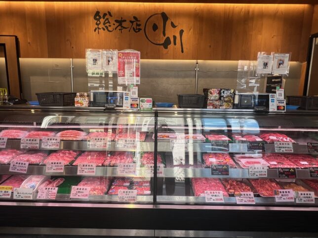 という、小川畜産の総本店へ。かなり綺麗な店舗なので、割と最近リニューアルをしているのかな。店舗は右側が精肉、左側がお惣菜・お弁当コーナーです。