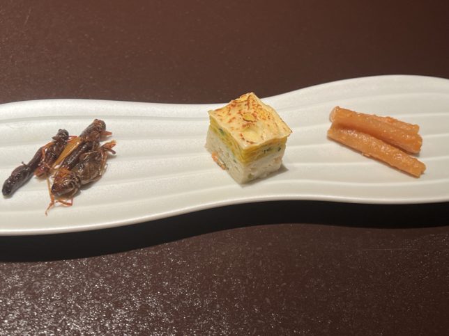 前菜の一つが、イナゴの佃煮。長野に来ている間があってとても良い。