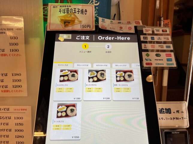 店内に入りました。入り口のマシンでオーダーする感じです。多言語対応が簡単にできて良い感じですね。オーダーマシンの上では名物・そば屋の玉子焼きをプッシュしています。