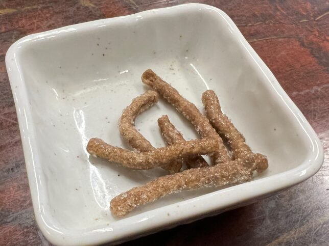 オーダーして席につくと、まずは揚げたお蕎麦が出てきます。ポリポリ食べながら待つのは良いですね。