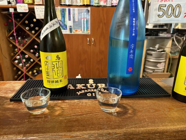 その場で飲めるので城崎湯上がり酒 宇兵衛 (ウベイ)と、もう1つはなるべき違う傾向の地酒を、と選んでもらいました。此の友酒造さんの但馬 山田錦特別純米です。