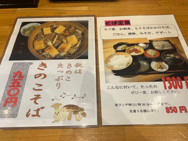 そば定食、というセットメニューもあります。同店の居酒屋メニューの人気No.1であるモツ煮・そば・お刺身・ご飯・漬物・味噌汁・デザート付きと中々豪華です。