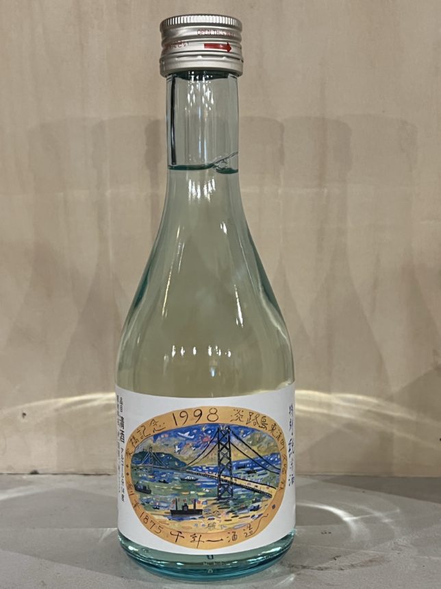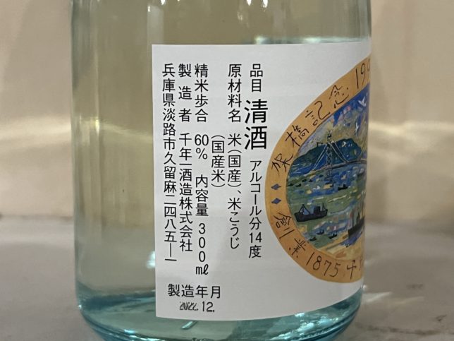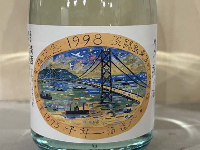 ラベル部分をアップで。架橋記念 1998 淡路島東浦町 久留麻と書かれています。絵からも伝わってきますが明石海峡大橋の開通記念で作られたお酒ということですね。淡路島東浦町 久留麻は千年一酒造さんのある地域名ですね。