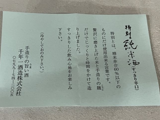 という、千年一酒造さんの特別純米酒を購入しました。