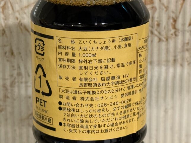 ボトル裏側です。カナダ産の大豆・小麦・食塩のみで作られています。ちなみに製造はサンビシさんです。