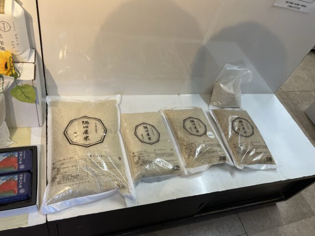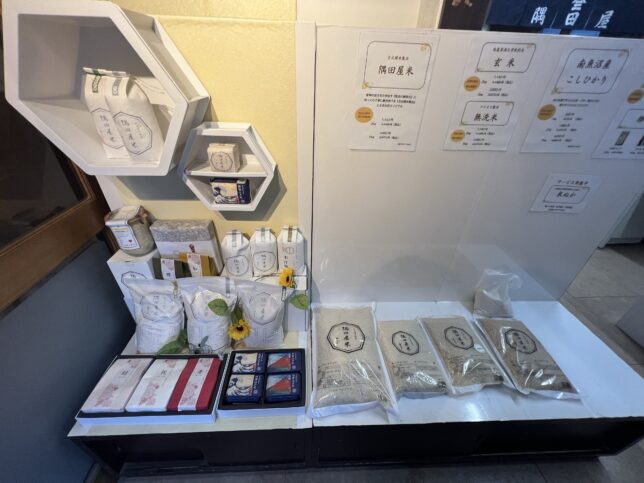 店内に入りました。様々なお米が複数のパッケージで売られています。お米のパッケージもバリエーションが沢山あるのですね。この隅田屋米が、古式精米×ブレンドの看板商品のようです。配合の黄金比という説明が素晴らしいですね。 こちらは6合紙袋の商品ですね。一番右はピエール・エルメのコラボ商品で洋風に合うお米のブレンドです。